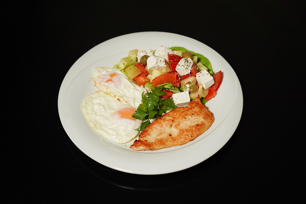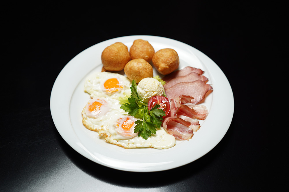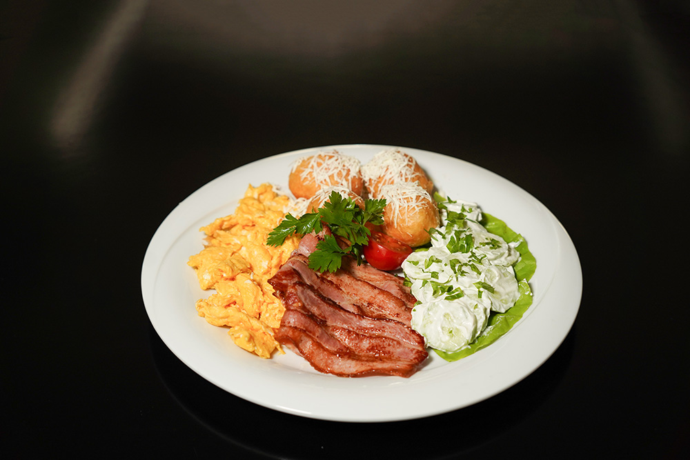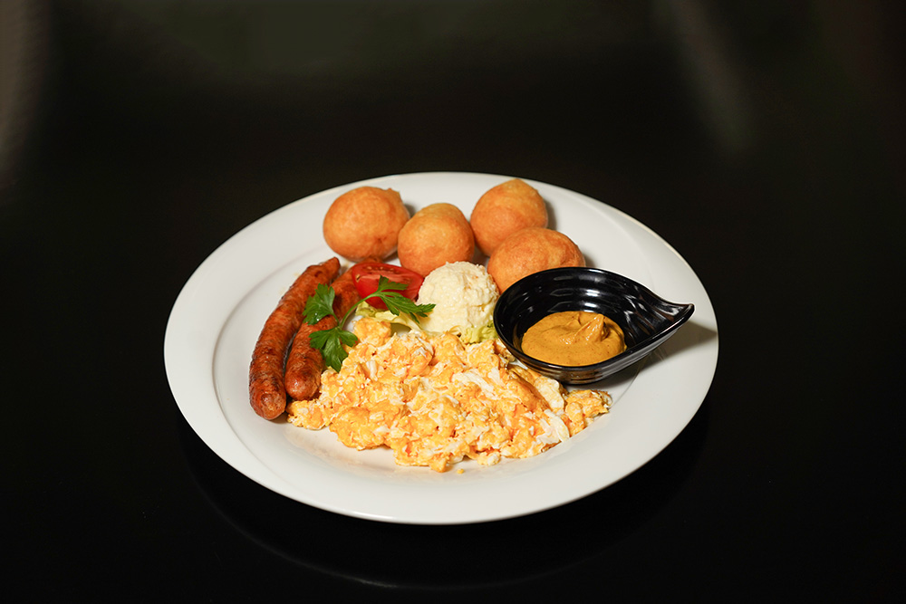 (jaja, ćureće kobasice, senf, kajmak, cherry, uštipci)